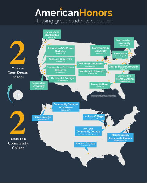 American Honors là chương trình Cao đẳng Cộng đồng (CĐCĐ) danh dự 2 + 2 (2 năm học CĐCĐ + 2 năm học Đại học). Đây là chương trình được công nhận tại Mỹ nhằm chọn ra các sinh viên ưu tú từ các trường CĐCĐ và chuyển tiếp lên các trường đại học danh tiếng với tổng chi phí 2 năm đầu chỉ từ $20,000 đến $25,000 một năm.