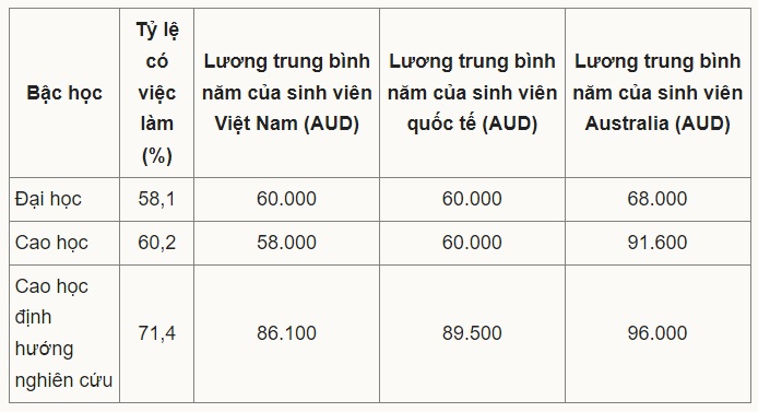 Tỷ lệ việc làm toàn thời gian cao nhất là những du học sinh tốt nghiệp cao học định hướng nghiên cứu với 71,4%. Lương trung bình của nhóm này là 86.100 AUD (1,35 tỷ đồng) một năm, thấp hơn mức trung bình của sinh viên quốc tế khoảng 50 triệu đồng. Mức cao nhất thuộc về sinh viên Iran với hơn 90.000 AUD mỗi năm.