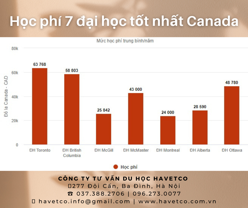 Học phí các đại học hàng đầu ở Canada dao động từ 25.000 đến 65.000 đôla Canada (CAD), tùy ngành và trường đại học.